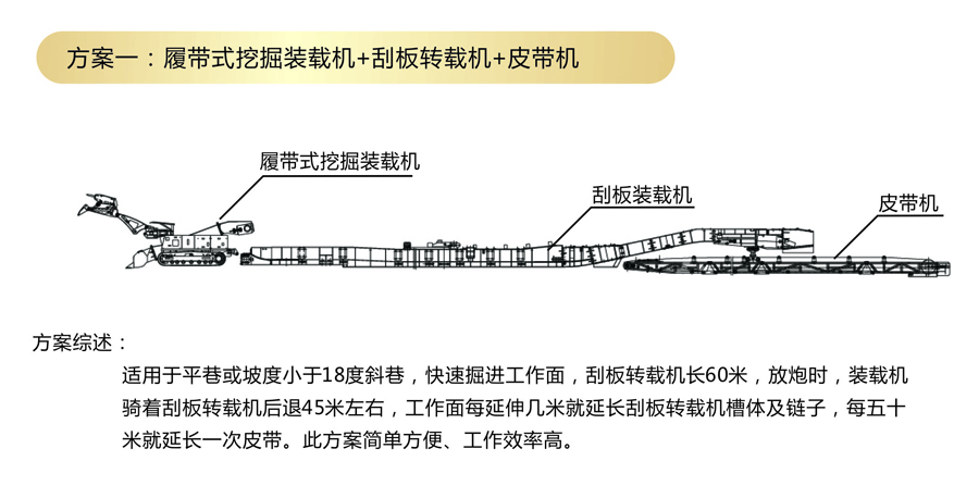 方案一:履帶式挖掘裝載機(jī)+滑板轉(zhuǎn)載機(jī)+皮帶機(jī)